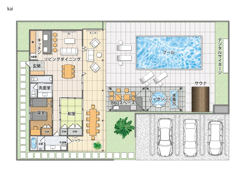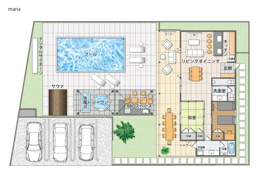 プールサイドには、220インチのLEDモニターを設備。