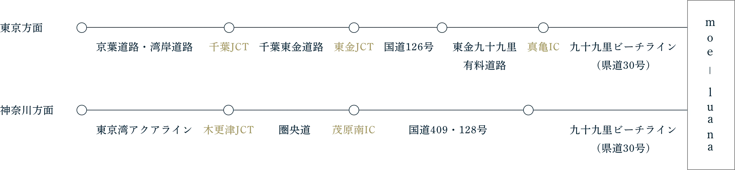 東京湾アクアライン→木更津JCT→圏央道「茂原南IC」→「国道409・128号」→九十九里ビーチライン(県道30号)→moe-luana