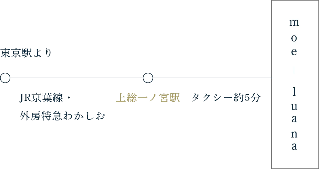 JR京葉線・外房特急わかしお→「上総一ノ宮駅」→タクシー約5分→moe-luala