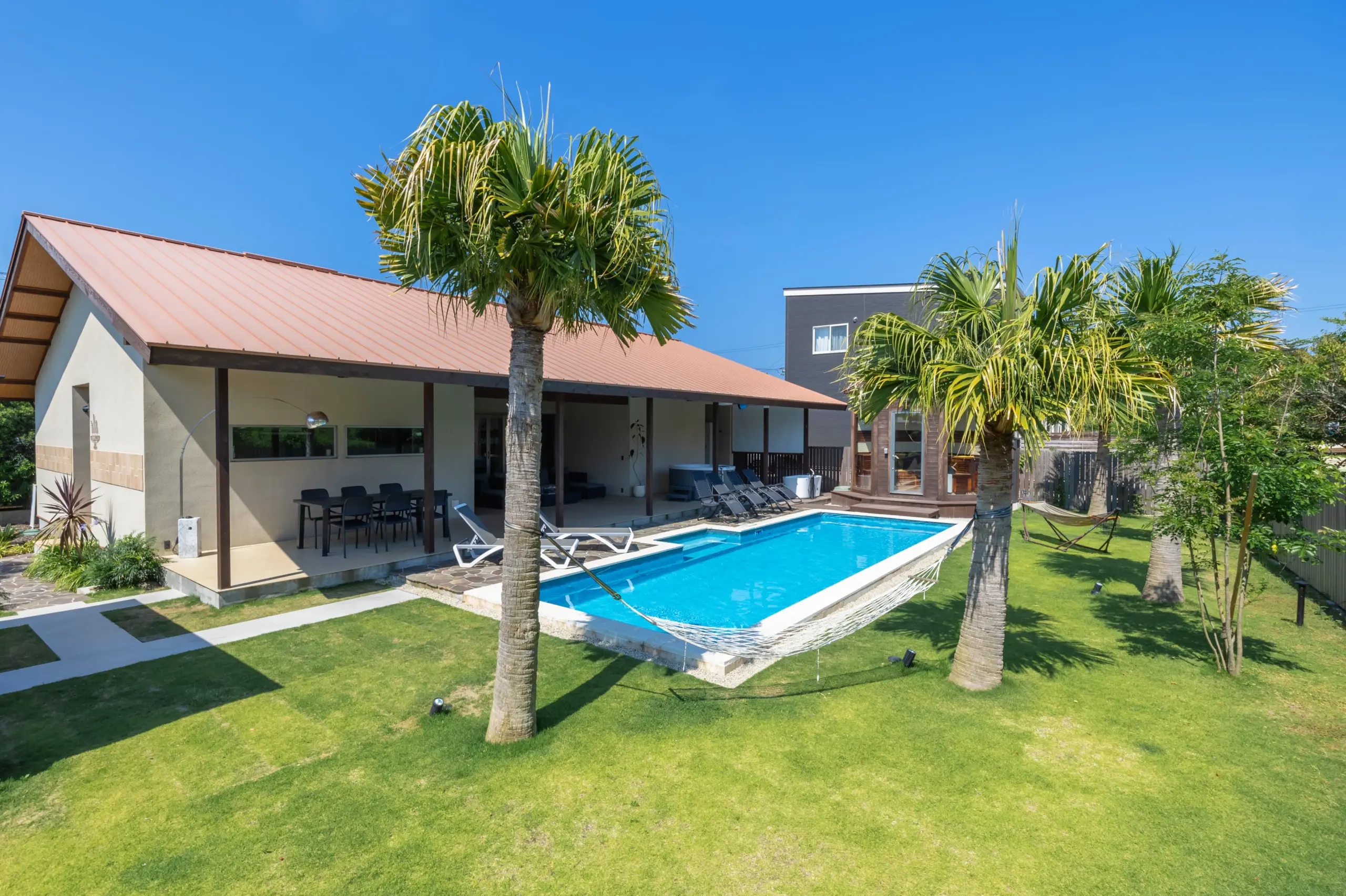 一棟貸切、キッチンあり、寝室複数、近隣スーパーあり、駐車場あり、食事サービスあり、ケータリング、食料品の持込可、プールあり、ペット可